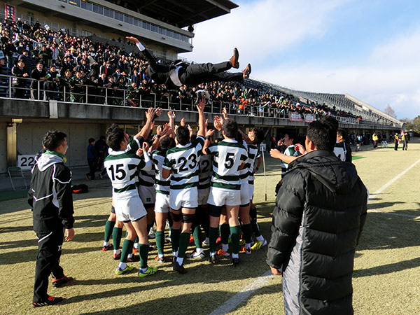 母校である専大ラグビー部の監督に就任して3年目の2014年、シーズン終了時に彼は歓喜の中心にいた。