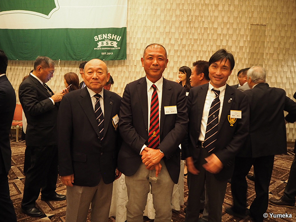 祝賀会は昔の映像を交えた専大ラグビーの歴史PVを観ながら16時キックオフ。司会は上田まりえ、専大OGで元日テレ、現在はフリーのアナウンサーとして活躍中。祝辞は遠山ラグビー部長、佐々木学長、元専務理事真下さん、関東協会会長水谷さん、専大上田体育部長と続き、リーグ連盟委員長である鏡さんの乾杯でリスタート。来賓者の多くは専修大学ラグビー部OB関係者に教職員から専大サポーターズクラブ、その他関東ラグビー協会関係、高校、大学、社会人、トップリーグの監督やコーチ陣、伊勢原からは給食員さん栄養士さん他、スポンサーの恵比寿機工、八十島プロシード、中村園等に保護者の方々まで総勢400名強と幅広く集まり、終始和やかなムードの中、祝賀会は催されました。